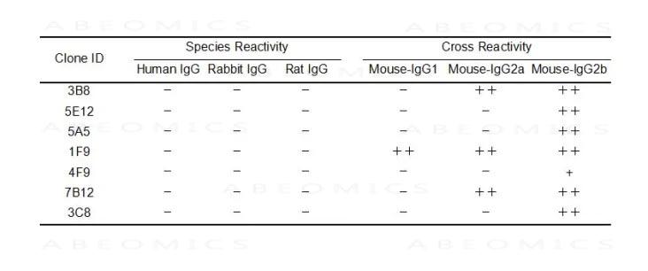 Figure 1. ELISA examination of goat anti-mouse IgG mAbs binding to immunogolobulins of different species and isotypes.