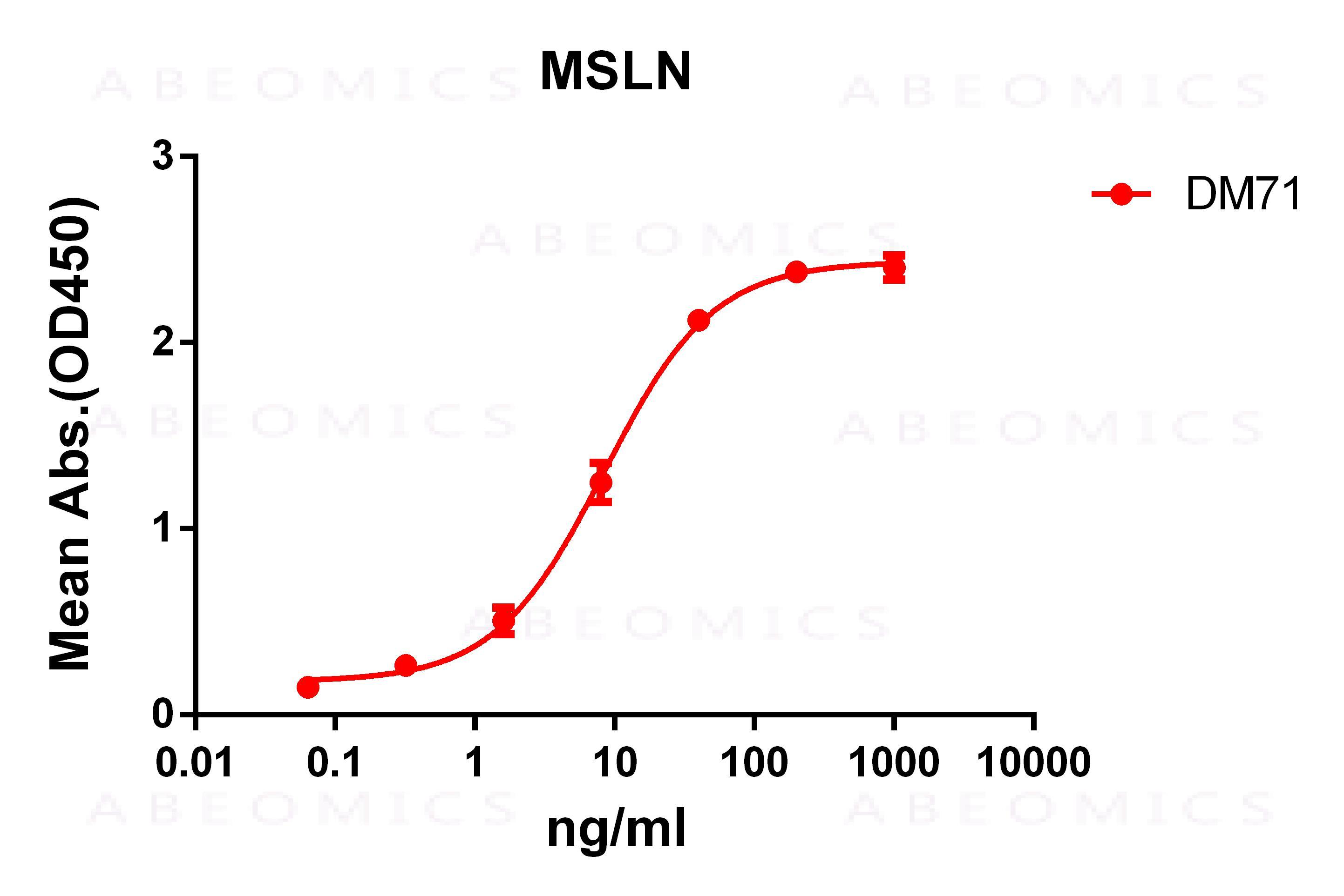 Figure 1. ELISA plate pre-coated by 2 µg/ml (100 µl/well) Human MSLN protein, mFc-His tagged protein can bind Rabbit anti-MSLN monoclonal antibody (clone: DM71) in a linear range of 1-100 ng/ml.