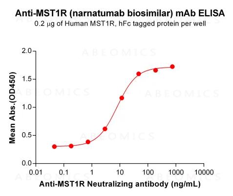 Figure 1. ELISA plate pre-coated by 2 μg/mL (100 μL/well) Human MST1R Protein, hFc Tag can bind Anti-MST1R Neutralizing antibody in a linear range of 0.73-46.88 ng/mL. In order to specifically detect BME100118, mouse anti-human Fab-specific antibody was used as detection antibody.