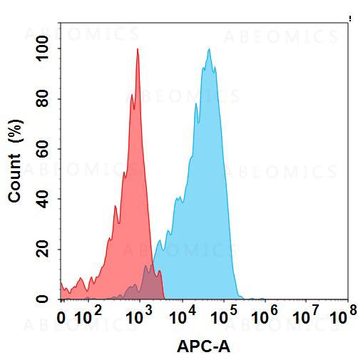 Figure 1. Flow cytometry analysis with 0.5 μg/mL Anti-Myc Tag(9E10) mAb on HEK293 cells transfected with Myc-tagged protein (Blue histogram) or with irrelevant protein (Red histogram).