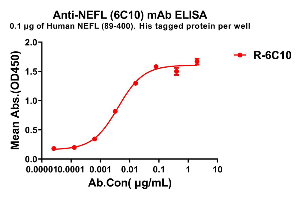 Figure 1. ELISA plate pre-coated by 1 μg/ml (100 μl/well) Human NEFL(89-400) protein, His tagged protein can bind Rabbit anti-NEFL(89-400) monoclonal antibody(clone: 6C10) in a linear range of 1-100 ng/ml.