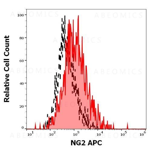 Figure 1: Separation of SK-MEL-30 cells stained using anti-human NG2 (7.1) APC antibody (10 μl reagent per million cells in 100 μl of cell suspension, red-filled) from SK-MEL-30 cells stained using mouse IgG1 isotype control (MOPC-21) APC antibody (concentration in sample 3 μg/ml, same as NG2 APC concentration, black-dashed) in flow cytometry analysis (surface staining) of REH cell suspension.