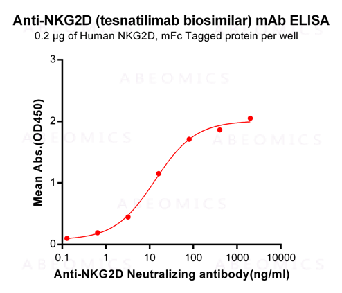 Figure-1: ELISA plate pre-coated by 2 μg/ml (100 μl/well) Human NKG2D, mFc tagged protein can bind Anti-NKG2D Neutralizing antibody in a linear range of 0.64-400 ng/ml.