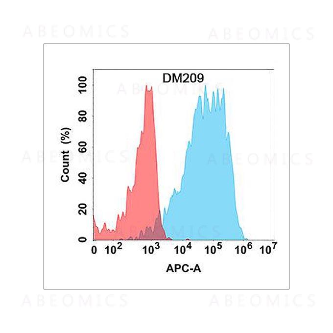 Figure 1. Flow cytometry analysis with Anti-NRG1 (DM209) on Expi293 cells transfected with human NRG1 (Blue histogram) or Expi293 transfected with irrelevant protein (Red histogram).