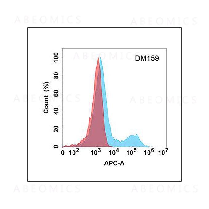 Figure 1. Flow cytometry analysis with Anti-NTB-A (DM159) on Expi293 cells transfected with human NTB-A (Blue histogram) or Expi293 transfected with irrelevant protein (Red histogram).