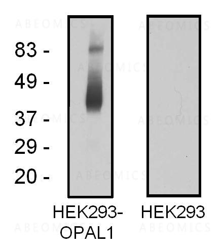 Figure 1: Western blotting analysis of OPAL1 in OPAL1-transfected HEK293 cells using mouse monoclonal antibody OPAL1-01.