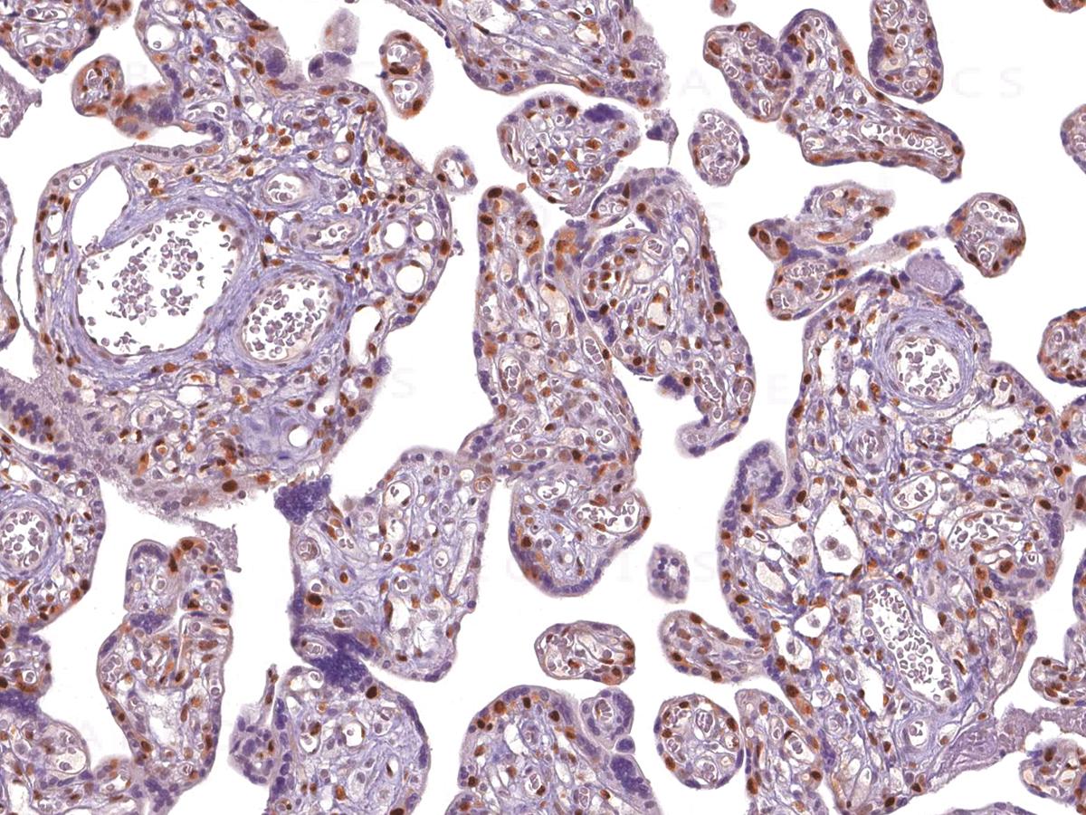 p57kip2, also known as p57, is a tumor suppressor protein that causes cell cycle arrest at G1 by binding G1 cyclin-CDK complexes. The p57kip2 gene is a potential tumor suppressor target as the gene is located in a chromosomal region implicated in sporadic cancers, Wilms' tumor, and Beckwith Wiedemann syndrome. Anti-p57kip2 labels many cytotrophoblast nuclei and stromal cells in normal placenta, and is useful in differentiating between complete hydatidiform mole and partial hydatidiform mole or hydropic abortion.