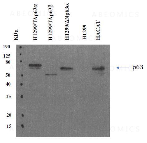 The p53 family of proteins includes three members, p53, p63, and p73. The protein p63 is encoded by TP63 gene, which gives rise to protein isoforms with different properties and functions due to the presence (TAp63) or absence (deltaNp63) of an N-terminal transactivation domain. Immunohistochemistry of p63 has a clinical relevance for certain tumor types, but investigations have been hampered by a lack of well characterized antibodies that are specific for p63 and do not cross-react with the related p53 and p73 proteins.