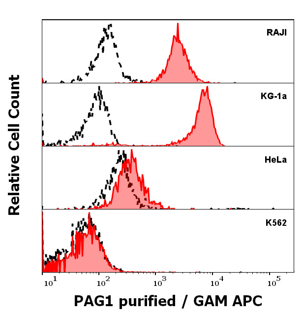 PAG (phosphoprotein associated with GEMs), also known as Cbp (Csk-binding protein), is a ubiquitously expressed 46 kDa transmembrane adaptor protein present in membrane rafts (glycosphingolipid-enriched microdomains), which however migrates on SDS PAGE gels anomalously as an 80 kDa molecule. Following tyrosine phosphorylation by Src family kinases, PAG binds and thereby activates the protein tyrosine kinase Csk, the major negative regulator of the Src family kinases. Signaling via the B-cell receptor in B cells or high affinity IgE receptor (FcepsilonRI) in mast cells leads to PAG increased tyrosine phosphorylation and Csk binding, while T cell receptor signaling causes PAG dephosphorylation, loss of Csk binding and increased activation of the protein tyrosine kinase Lck.
