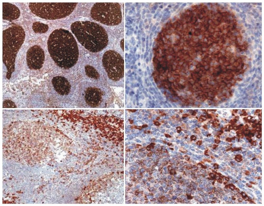 Figure 1: Immunohistochemistry staining (paraffin-embedded sections) using anti-Cbp/PAG (MEM-255).Cbp/PAG is expressed in germinal centers of lymph node lymphoid follicle and in follicular lymphoma (it is absent from mantle zone). Cbp/PAG is also expressed more weakly in T cells in tonsil and the thymic medulla.