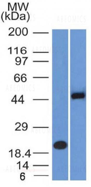 Fig. 1: Western Blot Analysis (A) Recombinant Protein (B) Raji cell lysate Using PAX8 Monoclonal Antibody (PAX8/1491 + PAX8/1492).