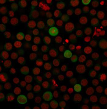 Fig. 1: Immunofluorescence Analysis of human Jurkat cells labeling PD-L1 with PD-L1 Mouse Monoclonal Antibody (PDL1/2743) followed by Goat anti-Mouse IgG-CF488 (Green). The nuclear counterstain is Reddot (Red)