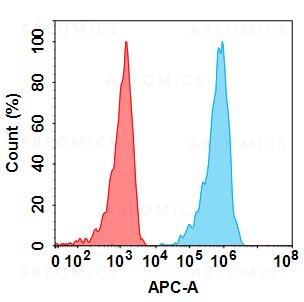 Figure 1. Flow cytometry analysis with 1 μg/mL Anti-PDL1(durvalumab biosimilar) mAb on Expi293 cells transfected with Human PDL1 protein (Blue histogram) or Expi293 transfected with irrelevant protein (Red histogram).