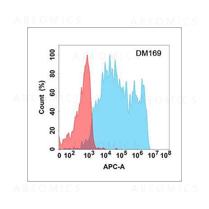 Figure 1. Flow cytometry analysis with Anti-PDL2 (DM169) on Expi293 cells transfected with human PDL2 (Blue histogram) or Expi293 transfected with irrelevant protein (Red histogram).