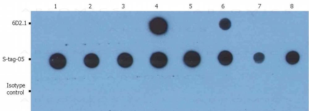 Figure 1: Dot Blot analysis of GST and GST-fusion proteins using anti-PKAc (6D2.1) and anti-GST (S-tag-05; ).The total amount of material spotted on the nitrocellulose membrane is 5 ng/spot. Lane 1: GST-Akt1. Lane 2: GST-Akt2. Lane 3: GST-Akt3. Lane 4: GST-PKAc alpha. Lane 5: GST-PKAc beta. Lane 6: GST-PKAc gamma. Lane 7: GST-MEK 1. Lane 8: GST