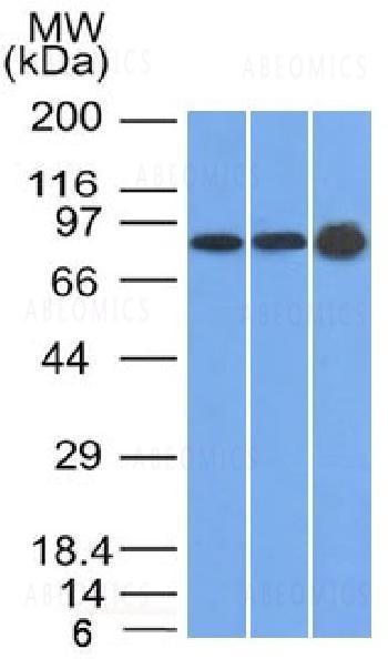 Fig. 1: Western Blot of U87, HeLa and A431 cell lysates using Plakophilin-1 Mouse Monoclonal Antibody (10B2)