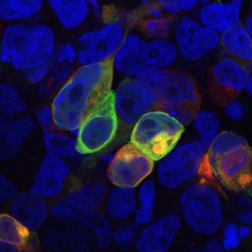 Figure 1: Immunofluorescence staining of HEK-293 cells cotransfected with PRR7 / TRAP3 (red) and GFP-PSD-95 (green). PRR7 / TRAP3 detected by monoclonal antibody TRAP3/10. DNA visualized by DAPI (blue).
