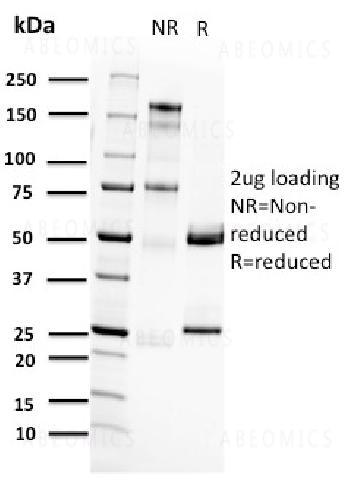 Fig. 1: SDS-PAGE Analysis Purified RET Mouse Monoclonal Antibody (RET/2662). Confirmation of Purity and Integrity of Antibody.