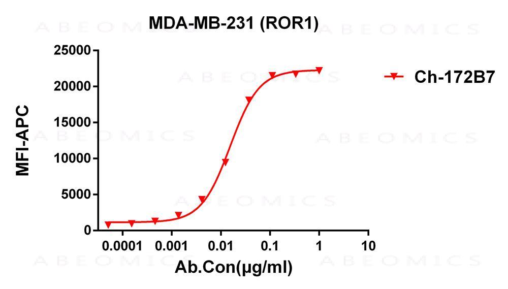 Figure 1. Flow cytometry data of serially titrated Rabbit anti-ROR1 monoclonal antibody (clone: 172B7) on MDA-MB-231 cells. The Y-axis represents the mean fluorescence intensity (MFI) while the X-axis represents the concentration of IgG used.