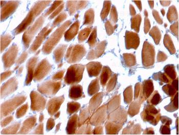 Fig. 1: Formalin-fixed, paraffin-embedded human Cardiac Muscle stained with Sarcomeric Actinin Alpha 2 Mouse Monoclonal Antibody (ACTN2/3292).