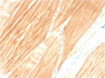 Fig. 1: Formalin-fixed, paraffin-embedded human Skeletal Muscle stained with Sarcomeric Actinin Alpha 2 Mouse Monoclonal Antibody (ACTN2/3295).