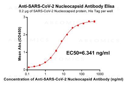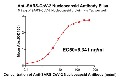 Figure 1. Elisa plate pre-coated by 2 µg/ml(100µl/well) SARS-CoV-2 Nucleocapsid protein, His Tag can bind Rabbit Anti-SARS-CoV-2 Nucleocapsid monoclonal antibody(clone:DM22) in a linear range of 0.24-62.5 ng/ml.