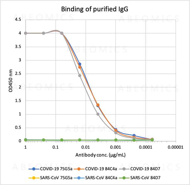 Figure-1: Microtiter wells were coated with SARS-CoV-2 Nucleocapsid Protein and SARS-CoV NP at 1 ug/mL. Purified rabbit monoclonal antibodies 75G5a (Cat# 12-4001), 84C4a (Cat# 12-4002), and 84D7 (Cat# 12-4003) were serially diluted 1:2 starting at 1 ug/mL. Rabbit monoclonal antibodies 75G5a, 84C4a, and 84D7 show very strong and specific binding to COVID-19 NP antigen, with no significant cross-reactivity to SARS-CoV NP antigen.