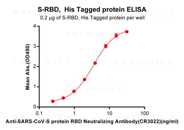 Figure-1: ELISA plate pre-coated by 2 μg/ml (100 μl/well) S-RBD, His tagged protein can bind Anti-SARS-CoV Neutralizing antibody (CR3022) in a linear range of 0.244-3.513ng/ml.