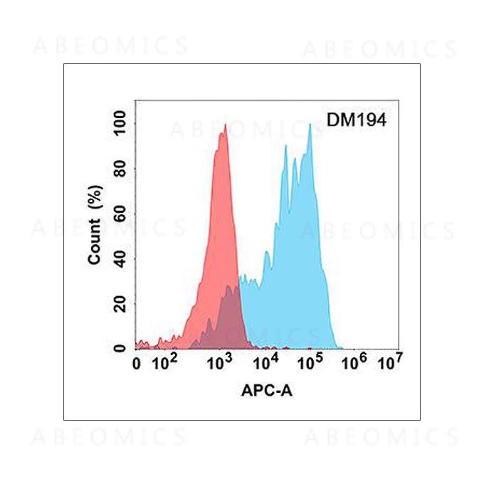 Figure 1. Flow cytometry analysis with Anti-SCF (DM194) on Expi293 cells transfected with human SCF (Blue histogram) or Expi293 transfected with irrelevant protein (Red histogram).