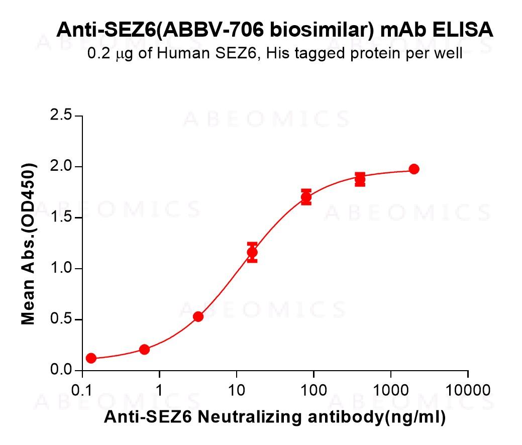 Figure 1. ELISA plate pre-coated by 2 µg/mL (100 µL/well) Human SEZ6 Protein, His Tag can bind Anti-SEZ6(ABBV-706 biosimilar) mAb in a linear range of 0.64–80 ng/mL.