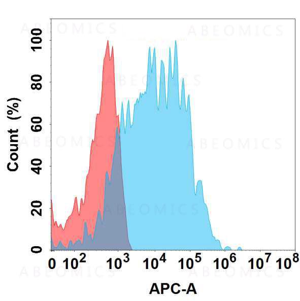 Figure 1. Flow cytometry analysis with 1μg/mL Anti-SEZ6 (31A10) mAb on Expi293 cells transfected with human SEZ6 (Blue histogram) or Expi293 transfected with irrelevant protein (Red histogram).