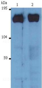Figure 1: Western Blotting analysis (reducing conditions) of human Sos using anti-Sos (SOS-01). Lane 1: K562 human Caucasian chronic myeloid leukemia cell line Lane 2: RAJI human Burkitt lymphoma cell line