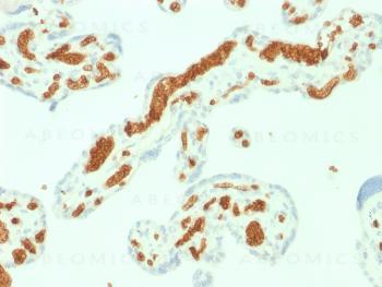 Fig. 1: Formalin-fixed, paraffin-embedded human Placenta stained with Spectrin alpha 1 (SPTA1) Mouse Monoclonal Antibody (SPTA1/1832).