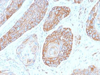 Western Blot (1-2ug/ml); Immunohistochemistry (Formalin-fixed) (1-2ug/ml for 30 minutes at RT) (Staining of formalin-fixed tissues requires heating tissue sections in 10mM Tris with 1mM EDTA, pH 9.0, for 45 min at 95°C followed by cooling at RT for 20 minutes);