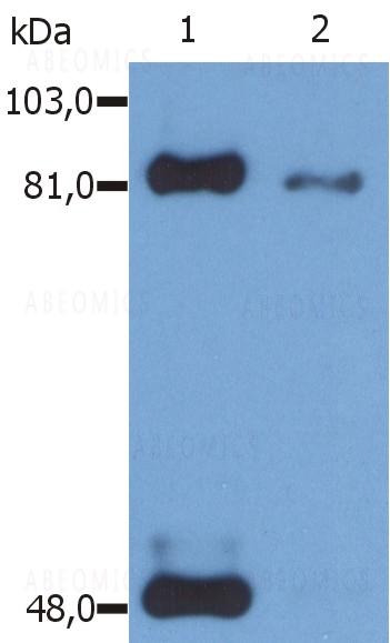 Figure 1: Western Blotting analysis (reducing conditions) of phosphorylated STAT1 (Ser727) in IFN-gamma treated HeLa human cervix carcinoma cell line using anti-Phospho STAT1 (PSM1). Lane 1: immunoprecipitated material by anti-STAT1 (SM2; ). Lane 2: original whole cell lysate