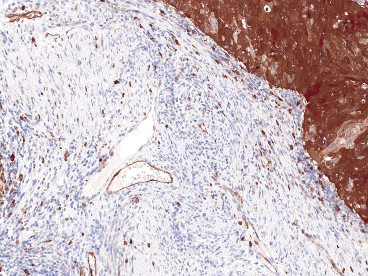 Stathmin regulates microtubule dynamics in the cell cycle. It is present in all tissues, but is mostly pronounced in constantly proliferating cell types. Since Anti-Stathmin staining has been found to correlate with cervical intraepithelial neoplasia (CIN) grade, CIN 3 presents the greatest expression and CIN1 displays the least expression of stathmin.
