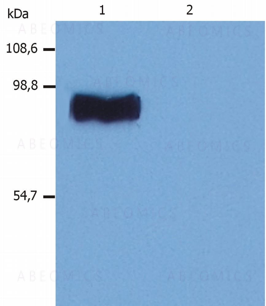 Figure 1: Western Blotting analysis (non-reducing conditions) of whole cell lysate of RBL rat basophilic leukemia cell line.Lane 1: immunostaining with anti-STIM1 (CDN3H4)Lane 2: immunostaining with Isotype mouse IgG1 control (PPV-06; )