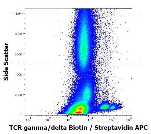 Figure 1: Flow cytometry surface staining pattern of human peripheral whole blood stained using anti-human TCR gamma/delta (B1) Biotin antibody (concentration in sample 15 μg/ml, Streptavidin APC).