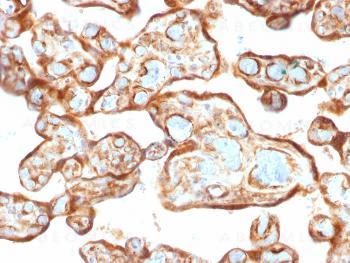 Fig. 1: Formalin-fixed, paraffin-embedded human Placenta stained with Thymidine Phosphorylase / PD-ECGF Monoclonal Antibody (P-GF.44C).