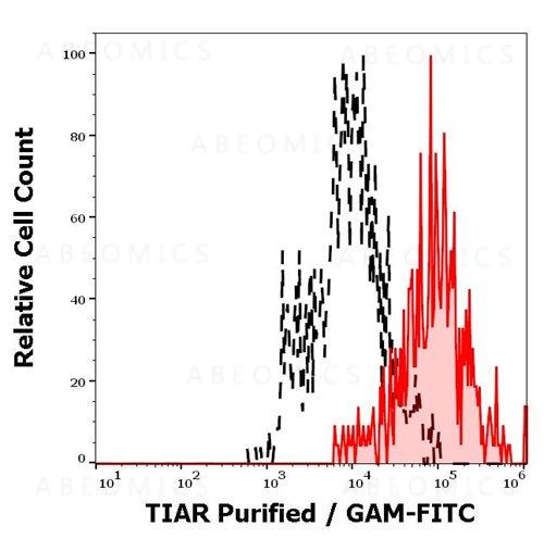 Figure 1: Flow cytometry staining of TIAR in human cell line A-431 using purified mouse monoclonal antibody 6E3 (concentration in sample 5 μg/ml, GAM FITC, red-filled) from A-431 cells unstained by primary antibody (GAM FITC, black-dashed) in flow cytometry analysis