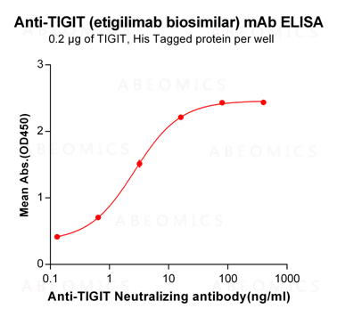 Figure-1: ELISA plate pre-coated by 2 μg/ml (100 μl/well) Human TIGIT, His tagged protein can bind Anti-TIGIT Neutralizing antibody in a linear range of 0.13-16.0 ng/ml.