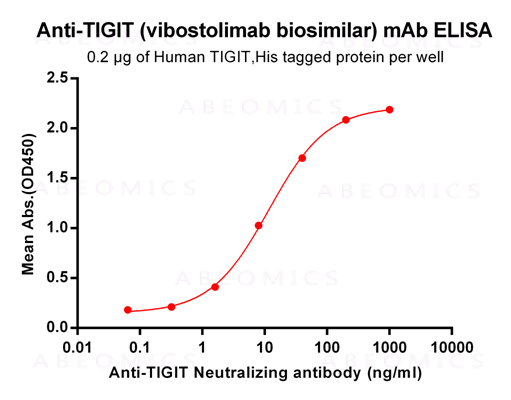 Figure-1: ELISA plate pre-coated by 2 μg/ml (100 μl/well) Human TIGIT, His tagged protein can bind Anti-TIGIT Neutralizing antibody in a linear range of 1.6-200.0 ng/ml.