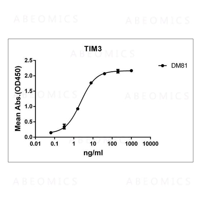 Figure 1. ELISA plate pre-coated by 2 μg/ml (100 μl/well) Human TIM3 protein, mFc-His tagged protein can bind Rabbit anti-TIM3 monoclonal antibody (clone: DM81) in a linear range of 0.32-40 ng/ml.