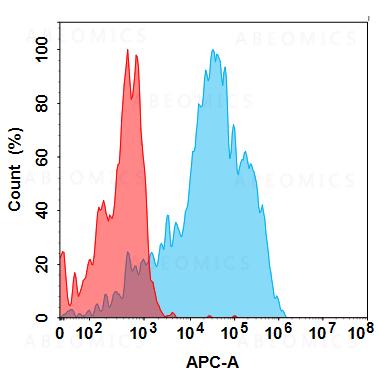 Figure 1. Flow cytometry analysis with 1μg/mL Anti-TIM3(sabatolimab biosimilar) mAb on Expi293 cells transfected with Human TIM3 protein (Blue histogram) or Expi293 transfected with irrelevant protein (Red histogram).