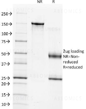 Fig. 1: SDS-PAGE Analysis of Purified TIMP1 Mouse Monoclonal Antibody (2A5). Confirmation of Integrity and Purity of Antibody.