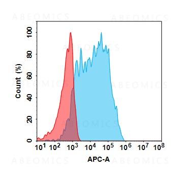 Figure 1. Flow cytometry analysis with 1 μg/mL Anti-TM4SF1 (AGX101 biosimilar) mAb on Expi293 cells transfected with Human TM4SF1 protein (Blue histogram) or Expi293 transfected with irrelevant protein (Red histogram).