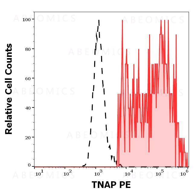 Figure 1: Separation of TNAP positive HeLa cells (red-filled) from TNAP negative HeLa cells (black-dashed) in flow cytometry analysis (surface staining) of HeLa cellular suspension stained using anti-TNAP PE antibody