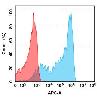 Figure 1. Flow cytometry analysis with 1μg/mL Anti-TNFa(golimumab biosimilar) mAb on Expi293 cells transfected with Human TNFa protein (Blue histogram) or Expi293 transfected with irrelevant protein (Red histogram).