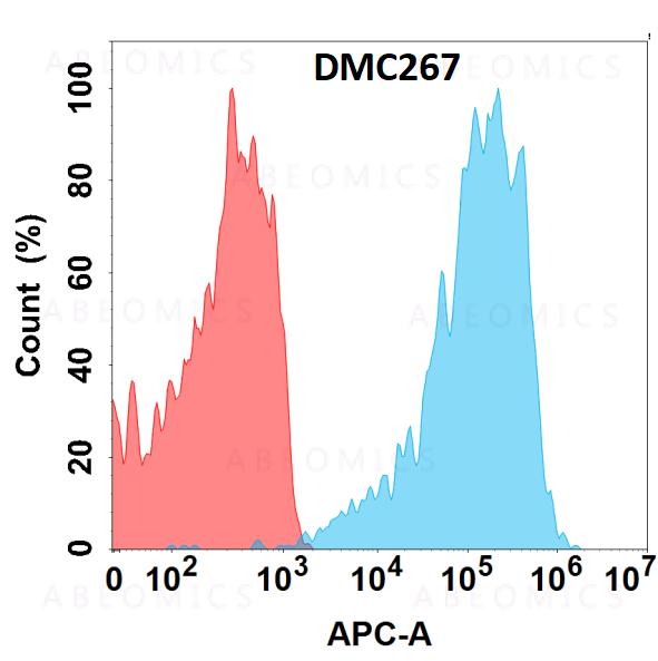 Figure 1. Flow cytometry analysis with Anti-TNFSF11 (DMC267) on Expi293 cells transfected with human TNFSF11 (Blue histogram) or Expi293 transfected with irrelevant protein (Red histogram).
