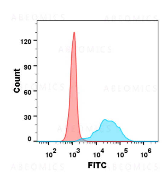 Figure 1. HEK293 cell line transfected with irrelevant protein (red histogram) and human TNFSF11 protein (blue histogram) were surface stained with Anti-TNFSF11 (denosumab biosimilar)mAb 1µg/ml followed by Alexa 488-conjugated Goat anti-Human IgG secondary antibody.
